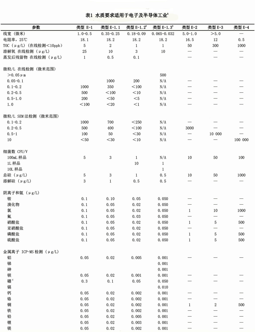 B:類型E-1.3中顯示的值是將國際半導體技術發展藍圖中己知污染物的風險因素與當前半導體加工中的相關線寬的生產制程進行校準的結果,在某些情況下這些值可能會與類型E-1.2中的值不同。用戶如果對E-1.2型水使用更高數值,可以放心使用。
